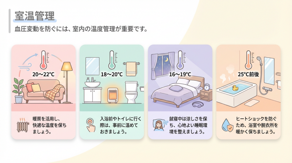 血圧変動を防ぐには、室内の温度管理が重要です。