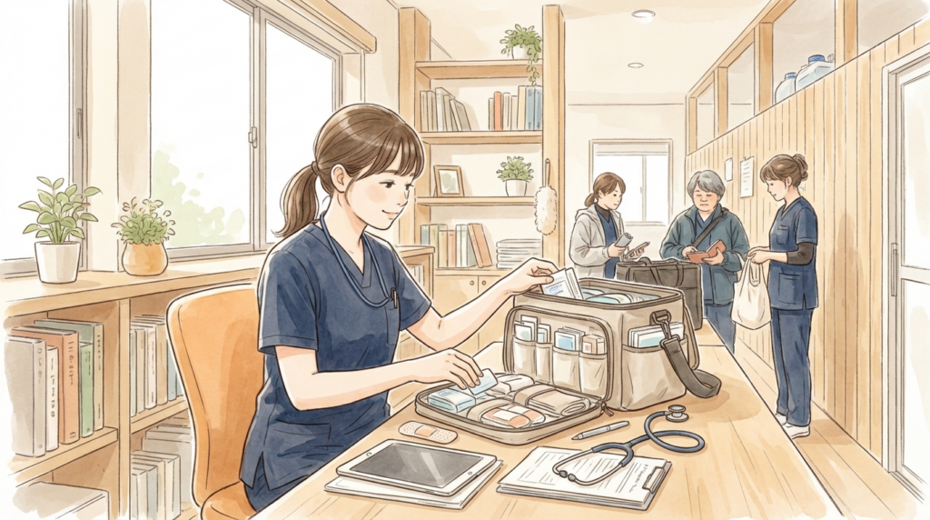 血圧計、聴診器、体温計などの基本的な医療器具に加え、訪問先で必要な医療材料や衛生用品を準備します。各利用者様の状態に応じて、必要な物品を過不足なく準備することが重要です。