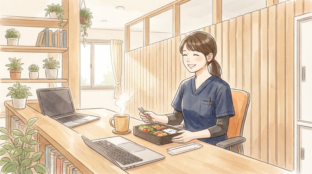 昼休憩を取り、午前中の訪問記録をまとめます。